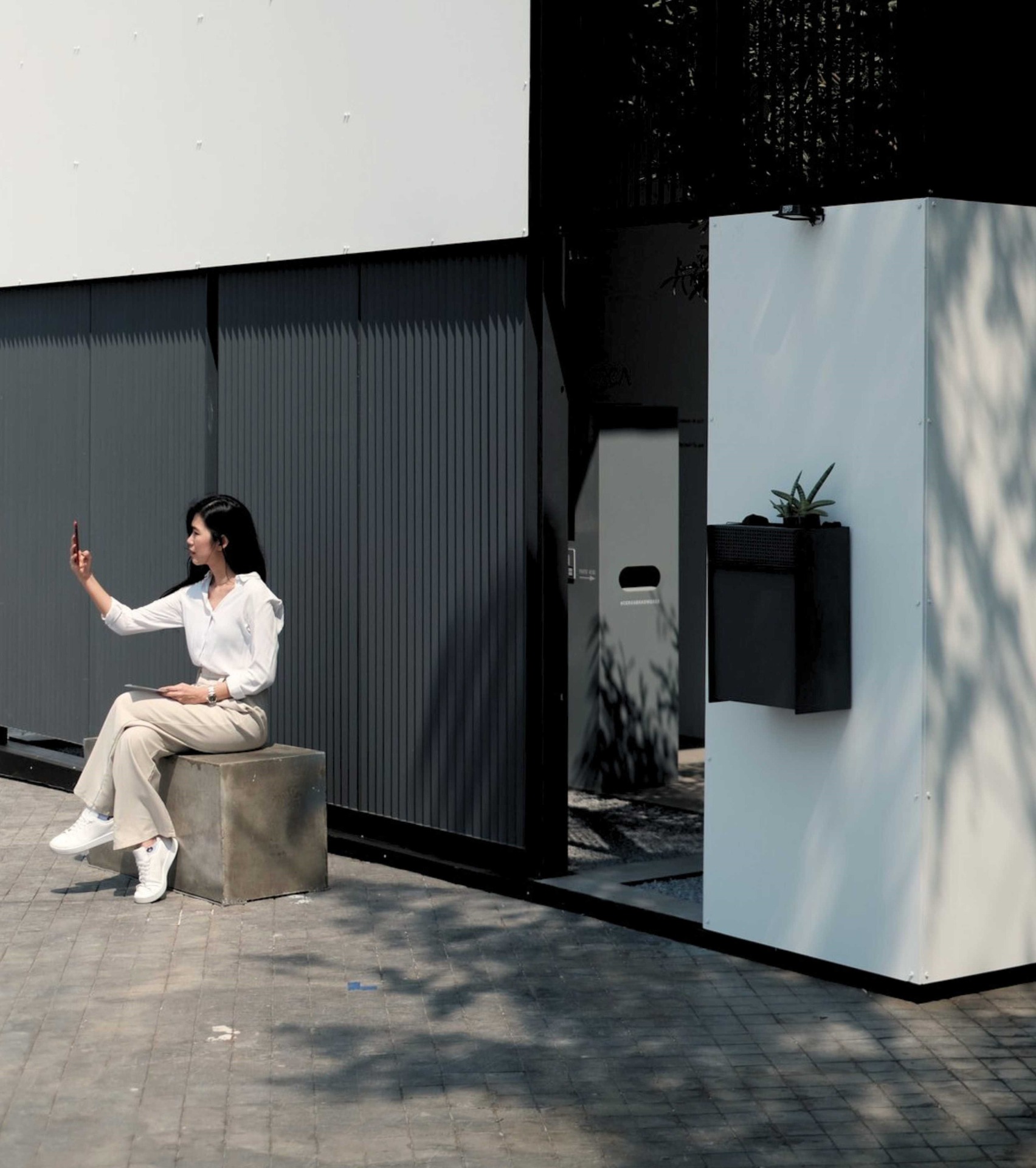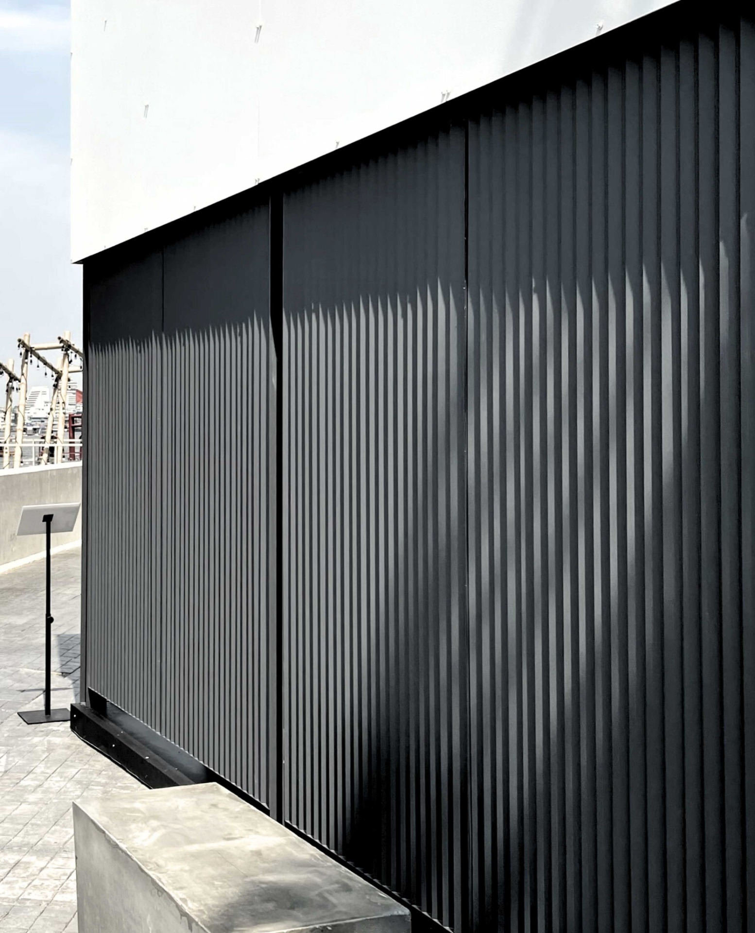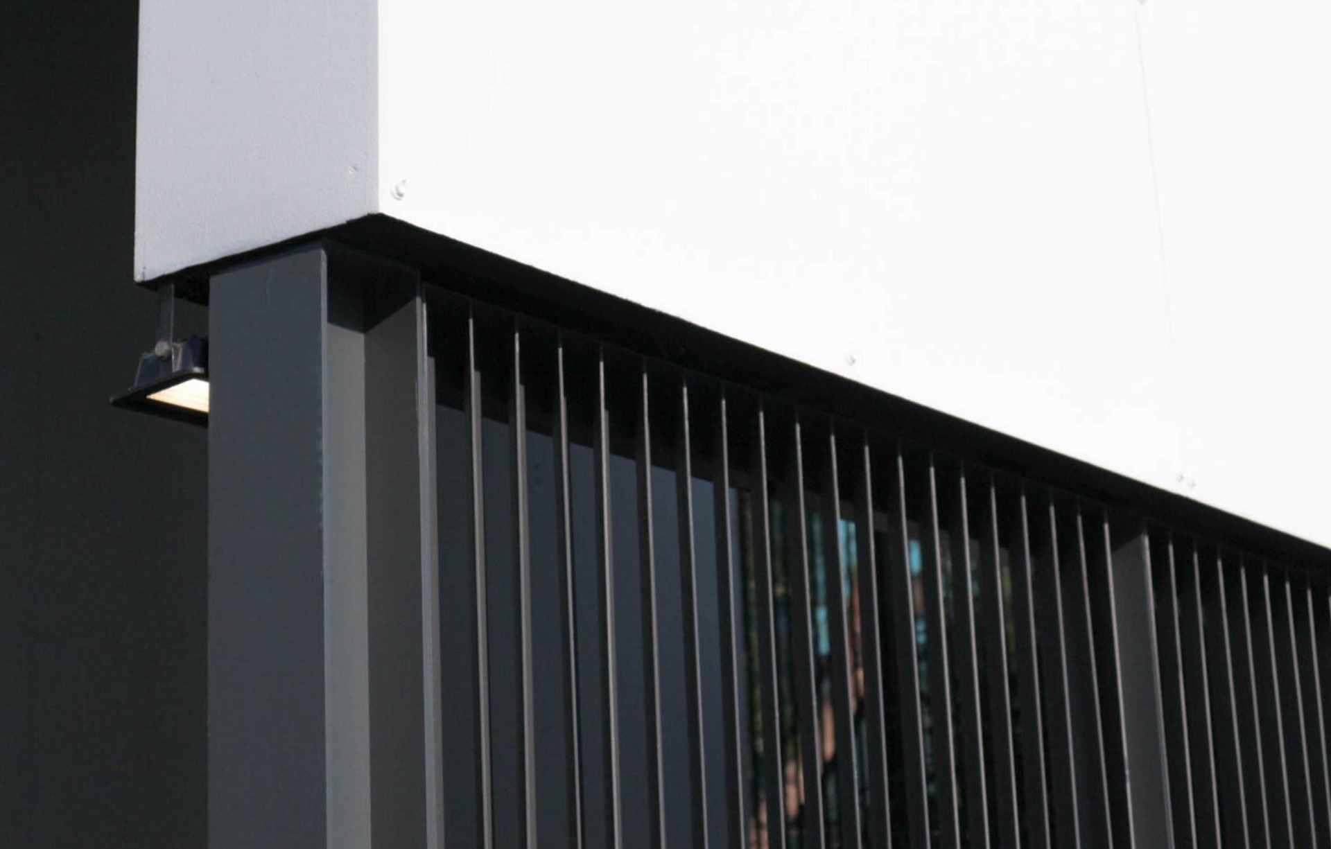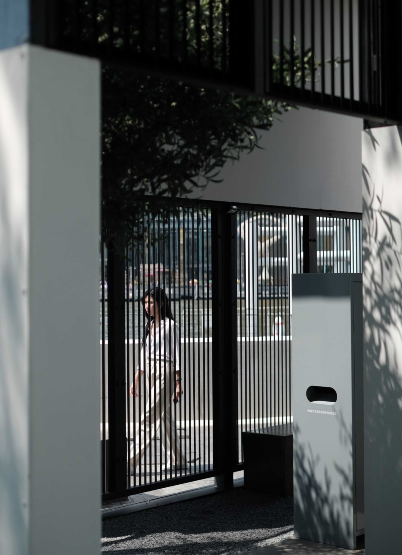 ระแนงรั้วเหล็กสูง 2 เมตร ออกแบบให้ระแนงมีความเรียงตัวสวยสไตล์ Modern Minimal เปิดรูรับแสงให้เข้าในตัวบ้านด้วยแสงธรรมชาติ ตามช่วงเวลาของวัน มีความ semi-private ให้ความรู้สึกไม่ทึบและไม่โปร่งมากเกินไป